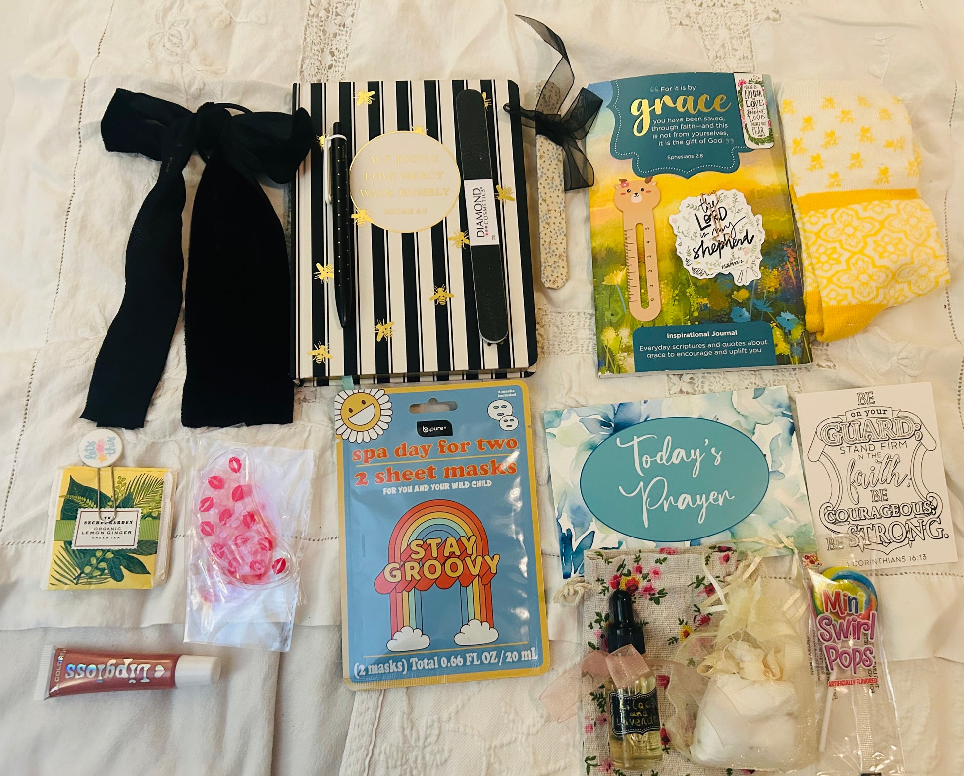 Facial mask, prayer card, coloring card, beautiful black bow hair tie, black sparkly nail file, stickers, 2 lemon ginger tea bags, homemade bookmark, cute animal bookmark, magnetic scripture bookmark, lip gloss, gold and white comfy socks, black sparkly pen, paper clips, lollipop, 1 yellow star barrette, cute eye patches, floral cloth gift bag, Lilacs and Lavender facial oil and Lavender foot soak.