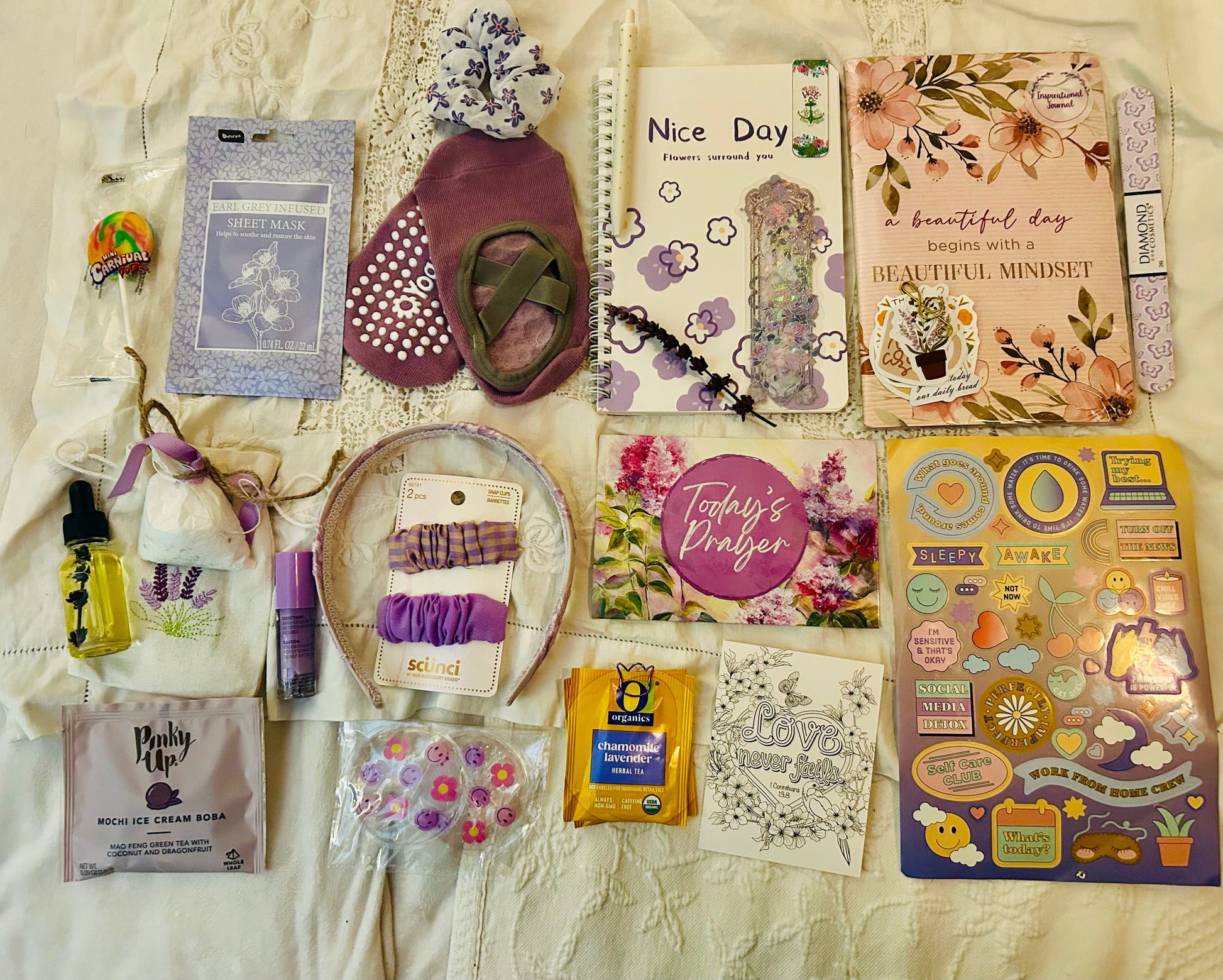 Decorative paperclips, lavender yoga socks, facial mask, lavender nail file, lavender floral bookmark, scripture magnetic bookmark, lavender boba lip gloss, stickers, sticker sheet, 2 chamomile/lavender tea bags, prayer card, decorative pen, coloring card, lollipop, lavender floral scrunchie, lavender/pink floral and smiley eye patches, set of two lavender barrettes, lavender embroidered cloth gift bag, Lilacs and Lavender facial oil, Lavender foot soak