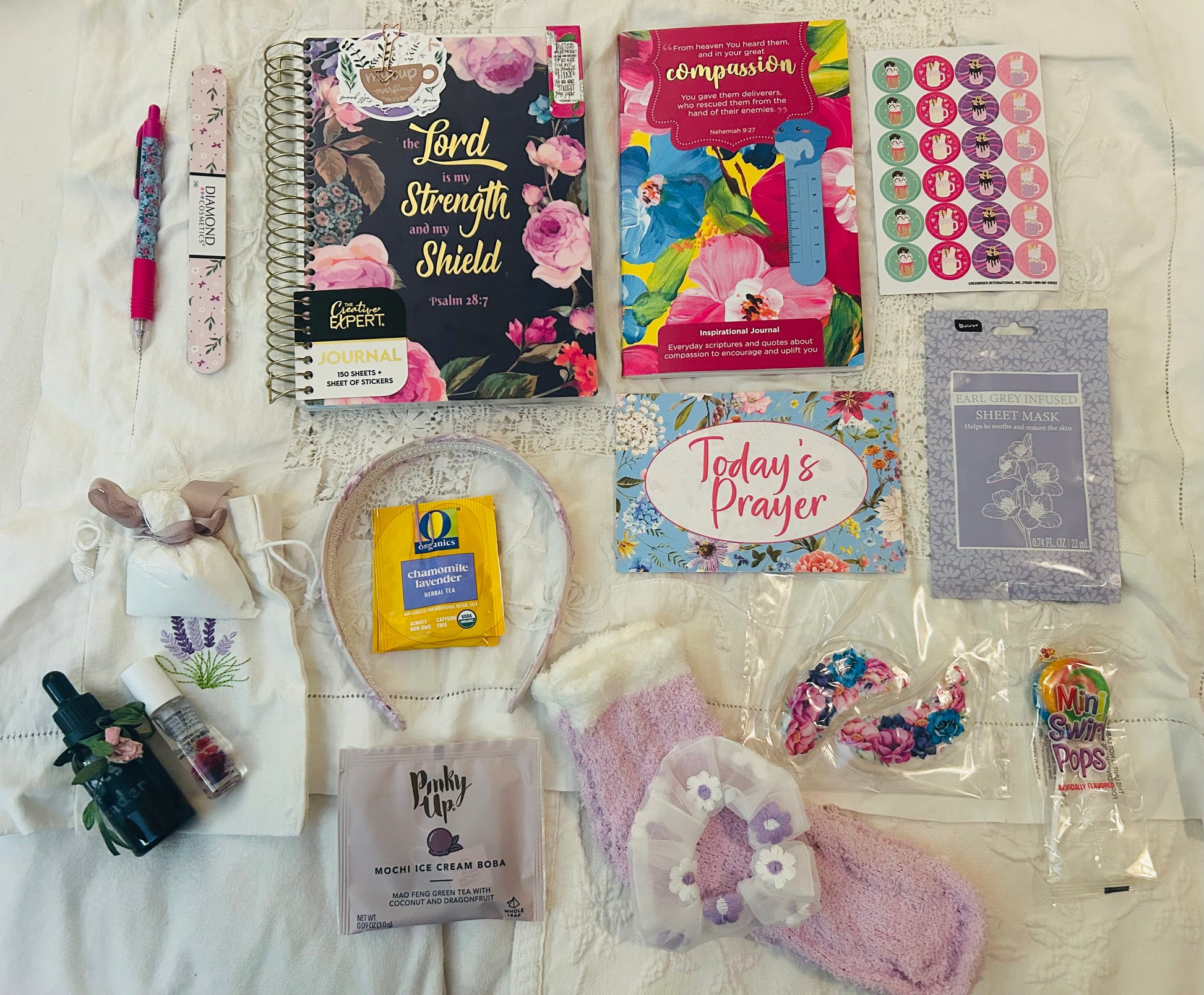Decorative pen, nail file, lollipop, lavender lace headband, lavender socks, bookmarks, scripture magnetic bookmark, 2 tea bags, hair scrunchie, facial mask, prayer card, stickers, Boba lip gloss, paper clips, lavender embroidered cloth gift bag, Lilacs and Lavender facial oil and Lavender foot soak, sticker page, and floral eye patches.